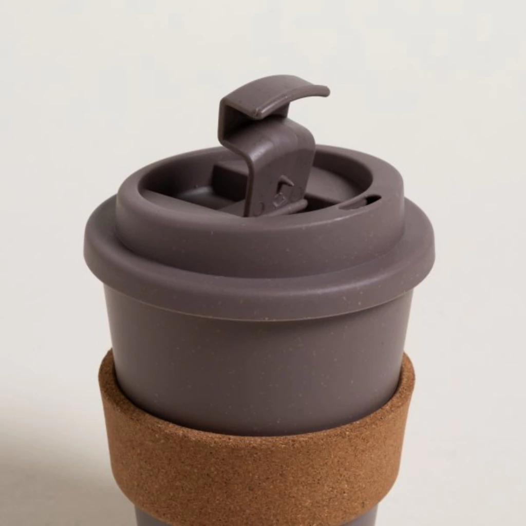 Vaso térmico bajo color visón, con agarre de corcho y cierre click.